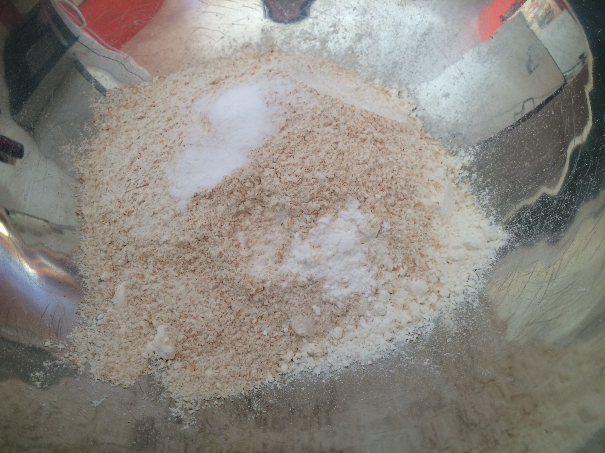 After going to the store to pick up some ingredients it was time to make the muffins. First, I combined all the dry ingredients in a large mixing bowl. That included the whole-wheat flour, AP flour, baking powder, baking soda, and some kosher salt.