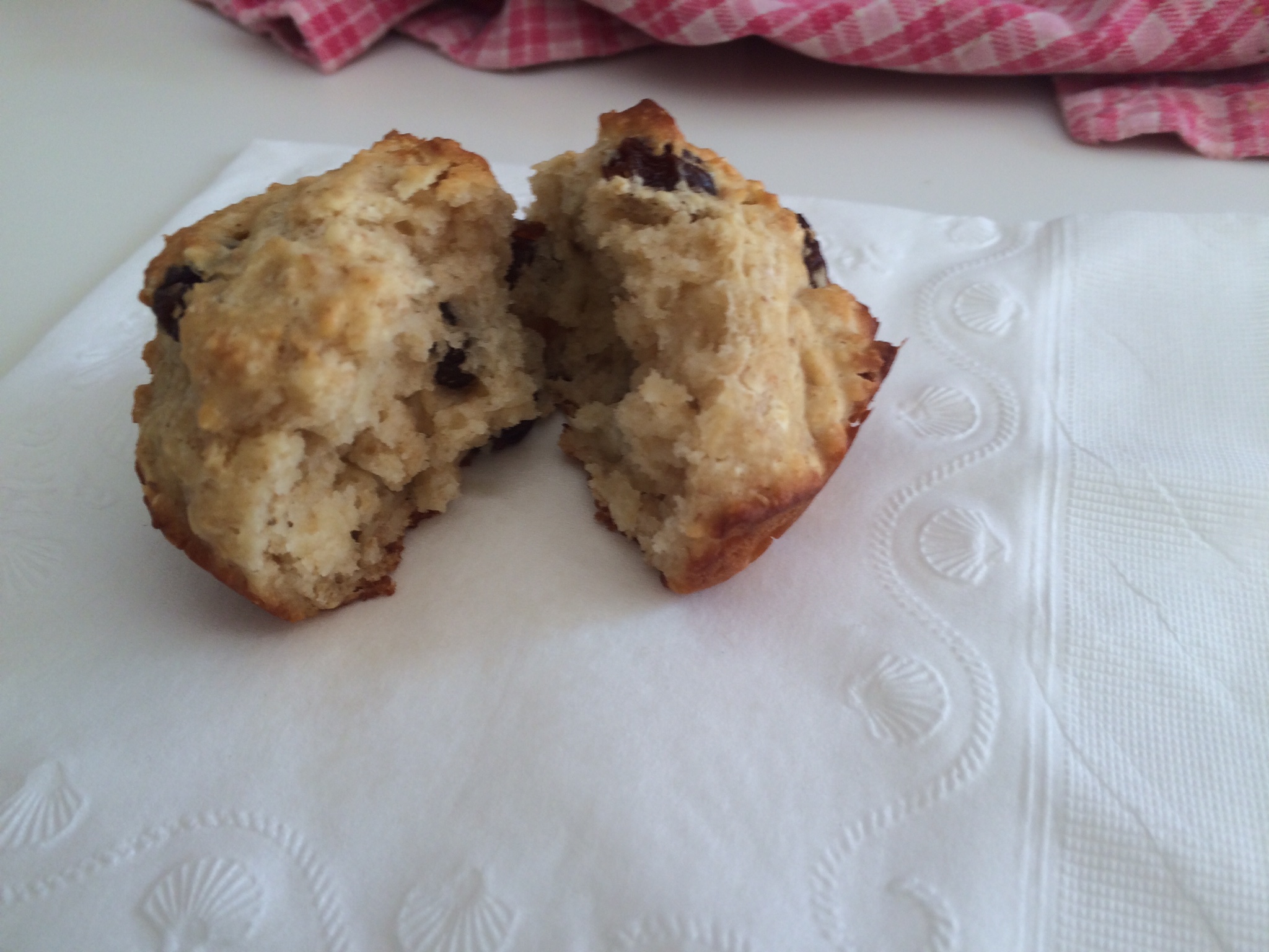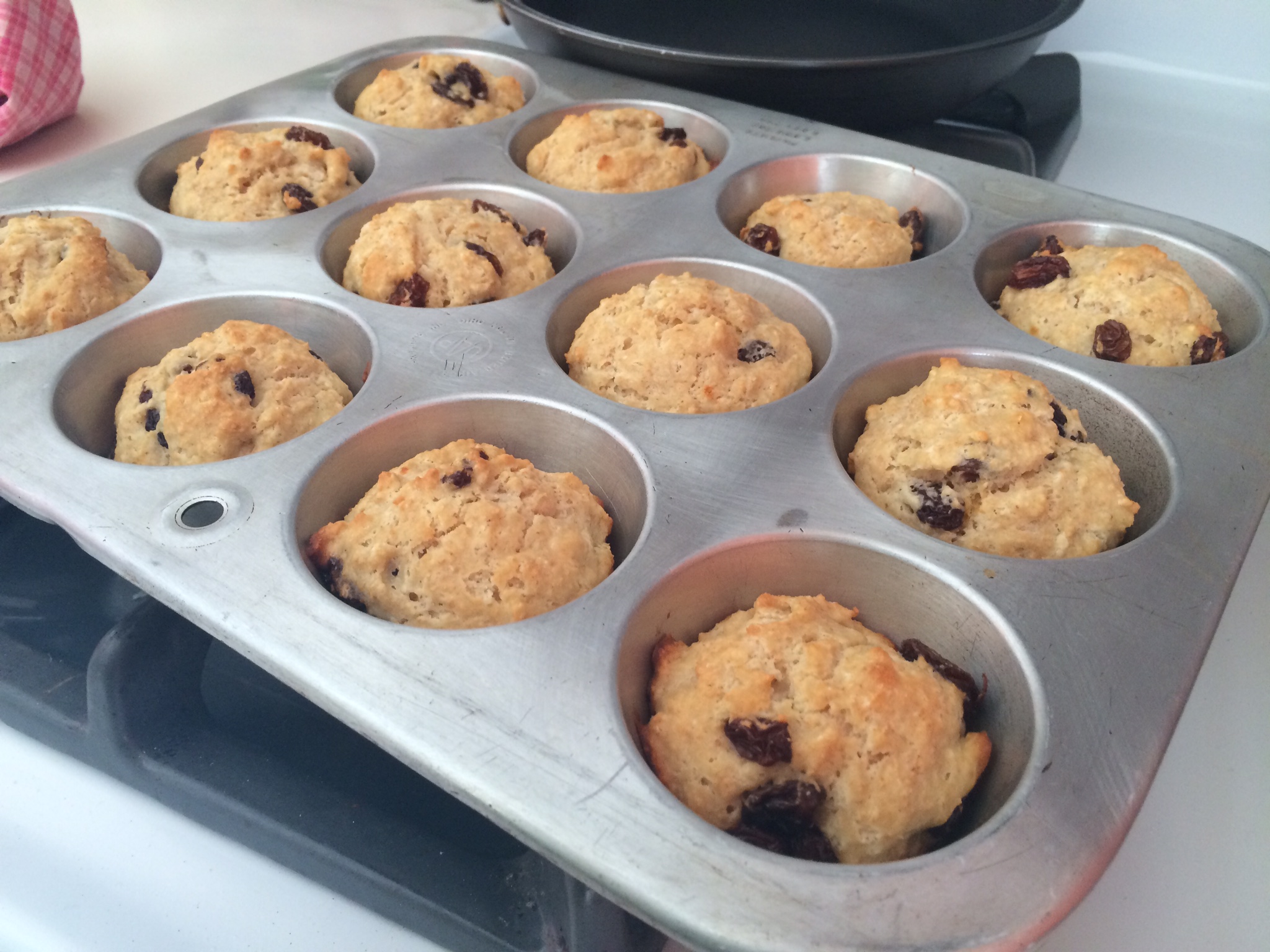 - Combine all the dry ingredients in one bowl. Next add the butter in until the mixture looks coarse. Next add the wet ingredients all together. Add the wet ingredients to the dry and stir until fully mixed together. Stir in the raisins. Add the mixture to the muffin tins and cook at 375 for about 20 minutes or until the muffins are golden brown on top! Enjoy!