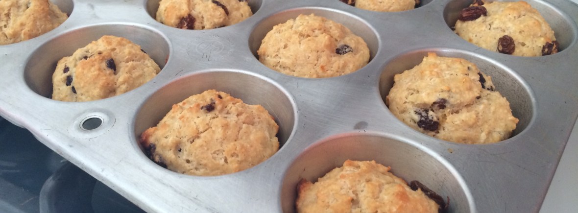 - Combine all the dry ingredients in one bowl. Next add the butter in until the mixture looks coarse. Next add the wet ingredients all together. Add the wet ingredients to the dry and stir until fully mixed together. Stir in the raisins. Add the mixture to the muffin tins and cook at 375 for about 20 minutes or until the muffins are golden brown on top! Enjoy!